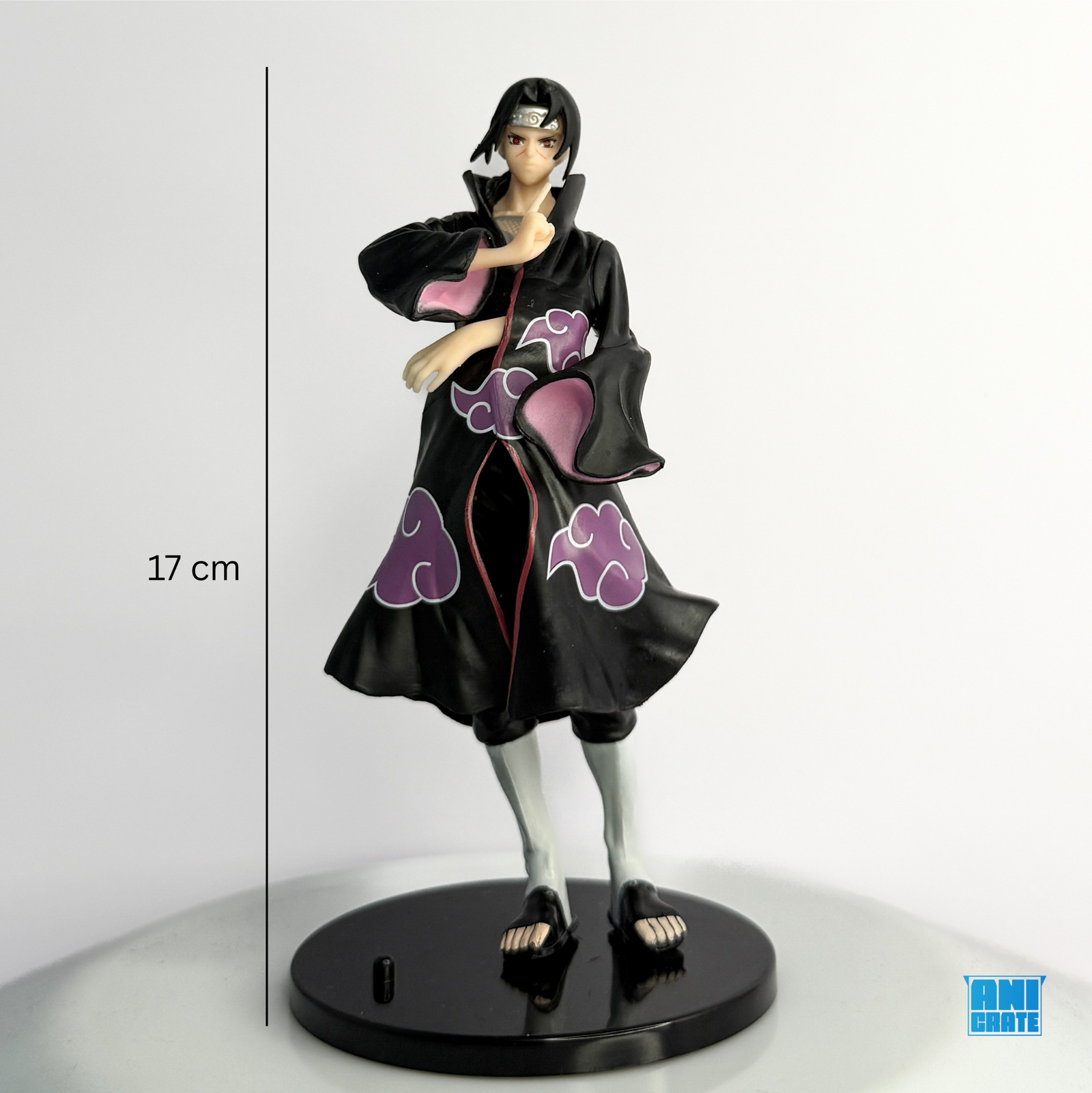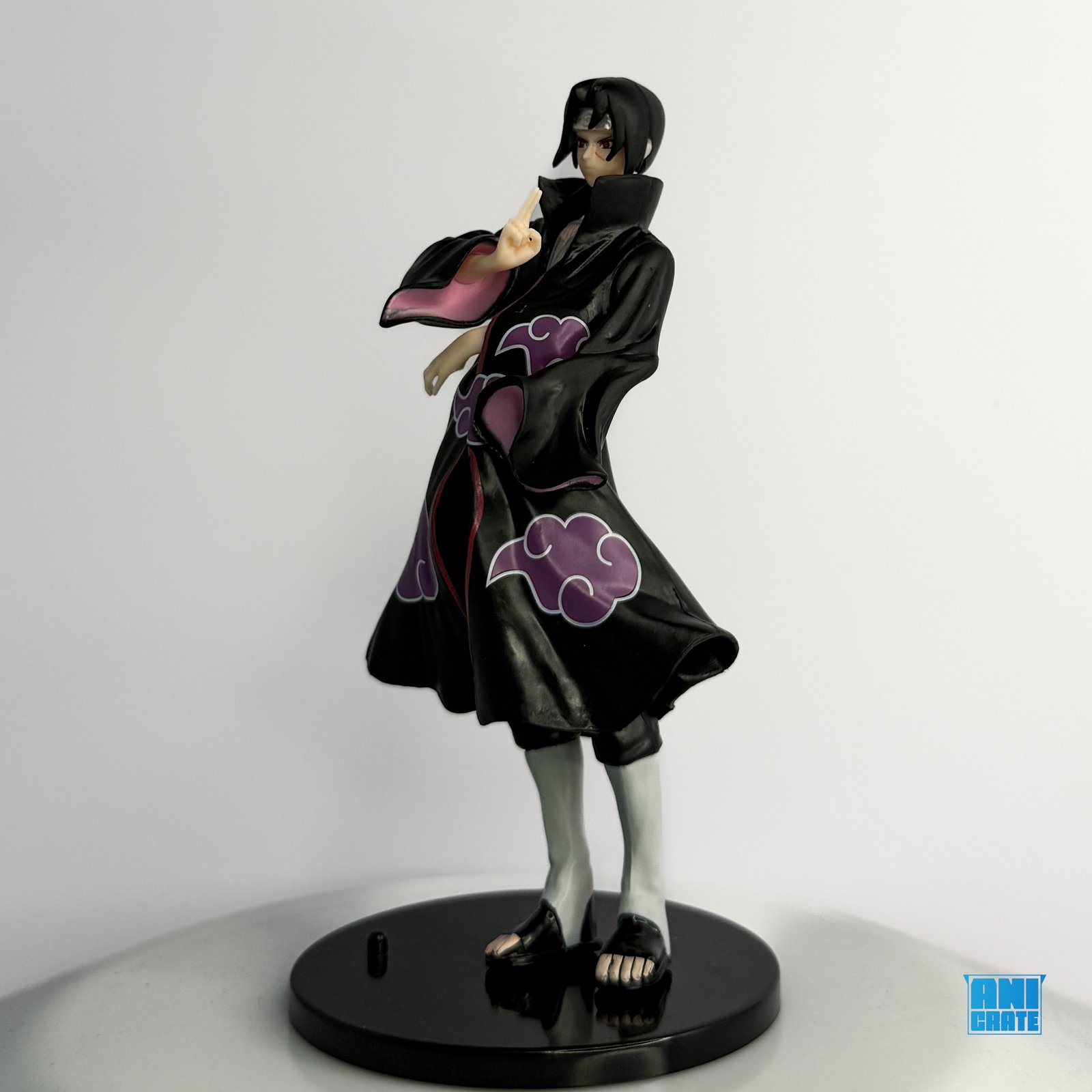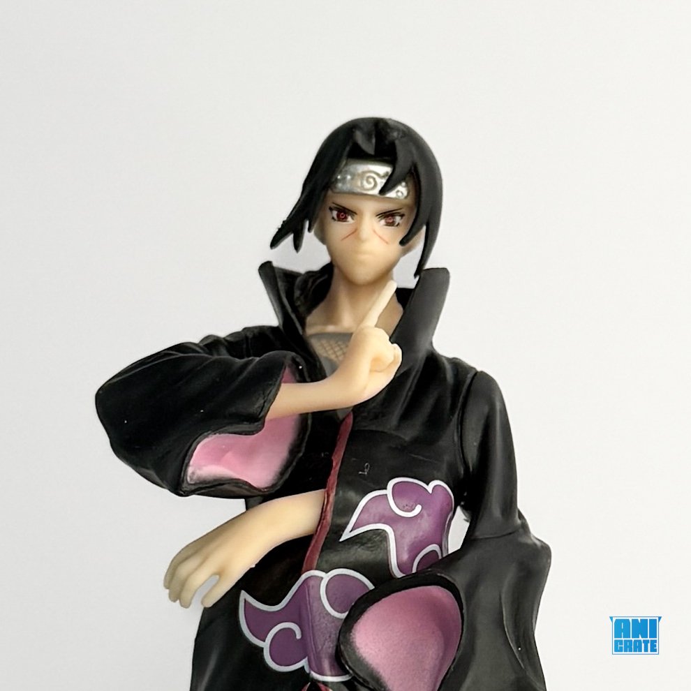 Detailed sculpt with Akatsuki cloak, Sharingan eyes, and iconic pose